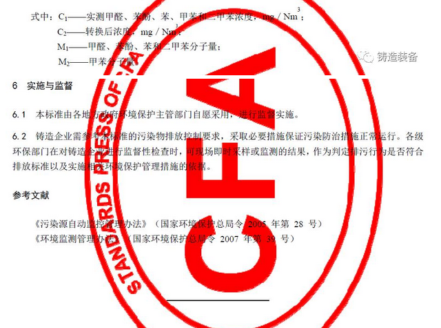 2017年7月31日,由中國(guó)鑄造協(xié)會(huì)發(fā)布的T/CFA030802-2—2017《鑄造行業(yè)大氣污染物排放限值》(中國(guó)鑄造協(xié)會(huì)標(biāo)準(zhǔn)公告 2017年 第06號(hào))發(fā)布。該標(biāo)準(zhǔn)于2017年10月1日起實(shí)施。
