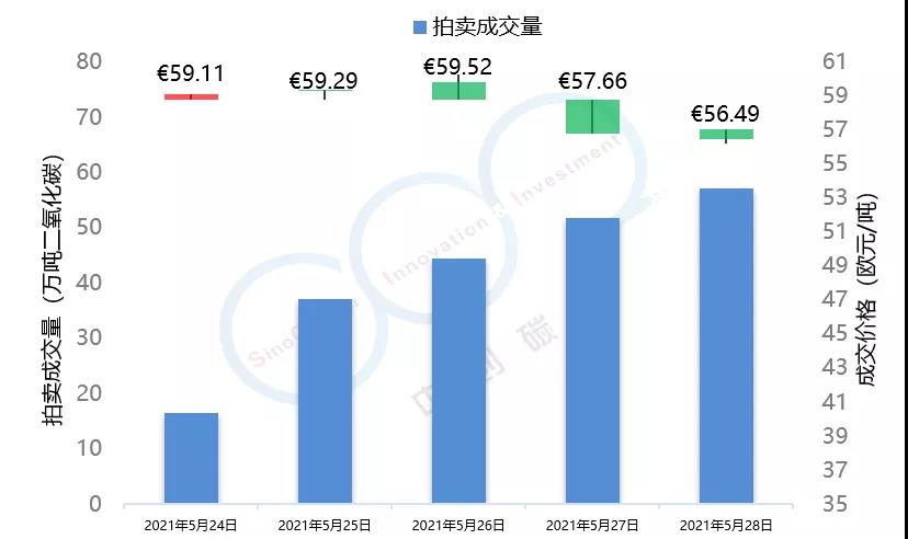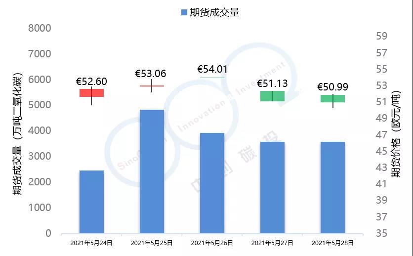 2021年5月24日至5月28日,由于全球能源市場表現(xiàn)較為疲軟,市場投資者對于配額需求的預期不景氣,歐盟碳市場在本周總體呈現(xiàn)下跌趨勢,在本周三漲至53.59歐元/噸的頂峰后,隨即下跌近5個點,最終收于50.95歐元/噸,回落至接近本月初水平。英國碳市場自上周三開市后,在本周迎來交易的第一個整周,在短期試探了59.52歐元/噸的碳價后,英國碳價逐步回落至56.49歐元/噸,該趨勢與歐盟碳市場基本保持一致。本周歐盟碳市場期貨成交量達到1.84億噸,配額拍賣量為平均每天300萬噸左右。英國碳市場本周拍賣成交量達到207萬噸。據(jù)悉,英國政府正在考慮增加2021年英國碳市場配額的拍賣供應。